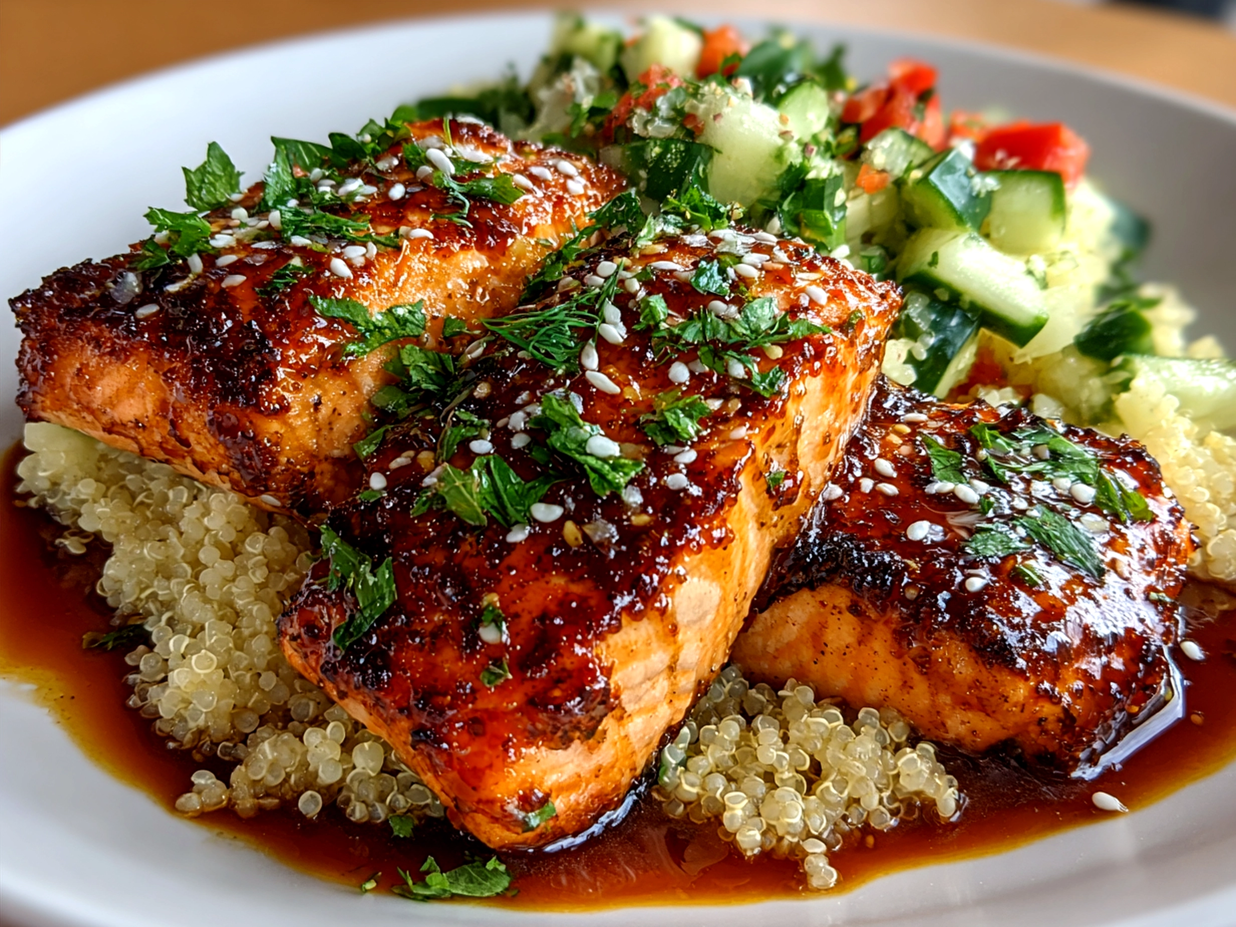 This Honey Glazed Salmon Bowl features tender, flaky salmon brushed with a sweet and savory honey glaze, served over a bed of steamed rice and fresh vegetables for a wholesome and flavorful meal.
