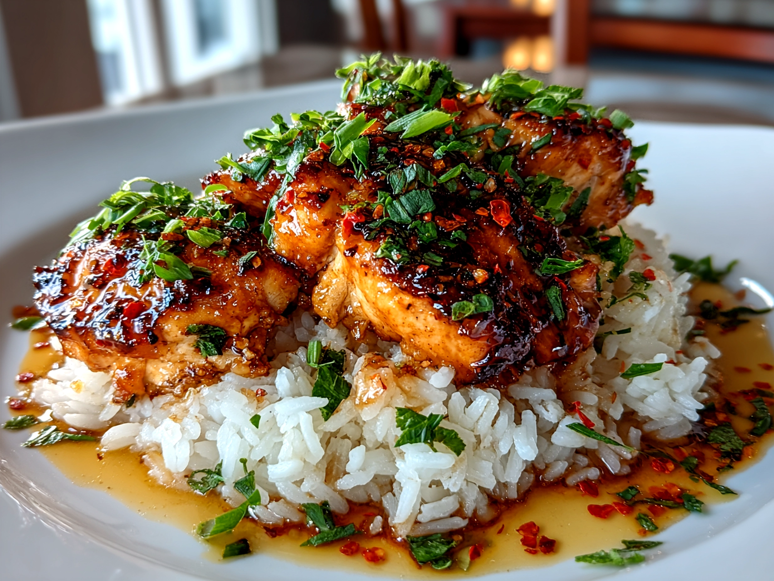 Enjoy a flavorful fusion with spicy maple-glazed chicken paired perfectly with creamy coconut rice, delivering a balanced blend of sweetness and heat in every bite.
