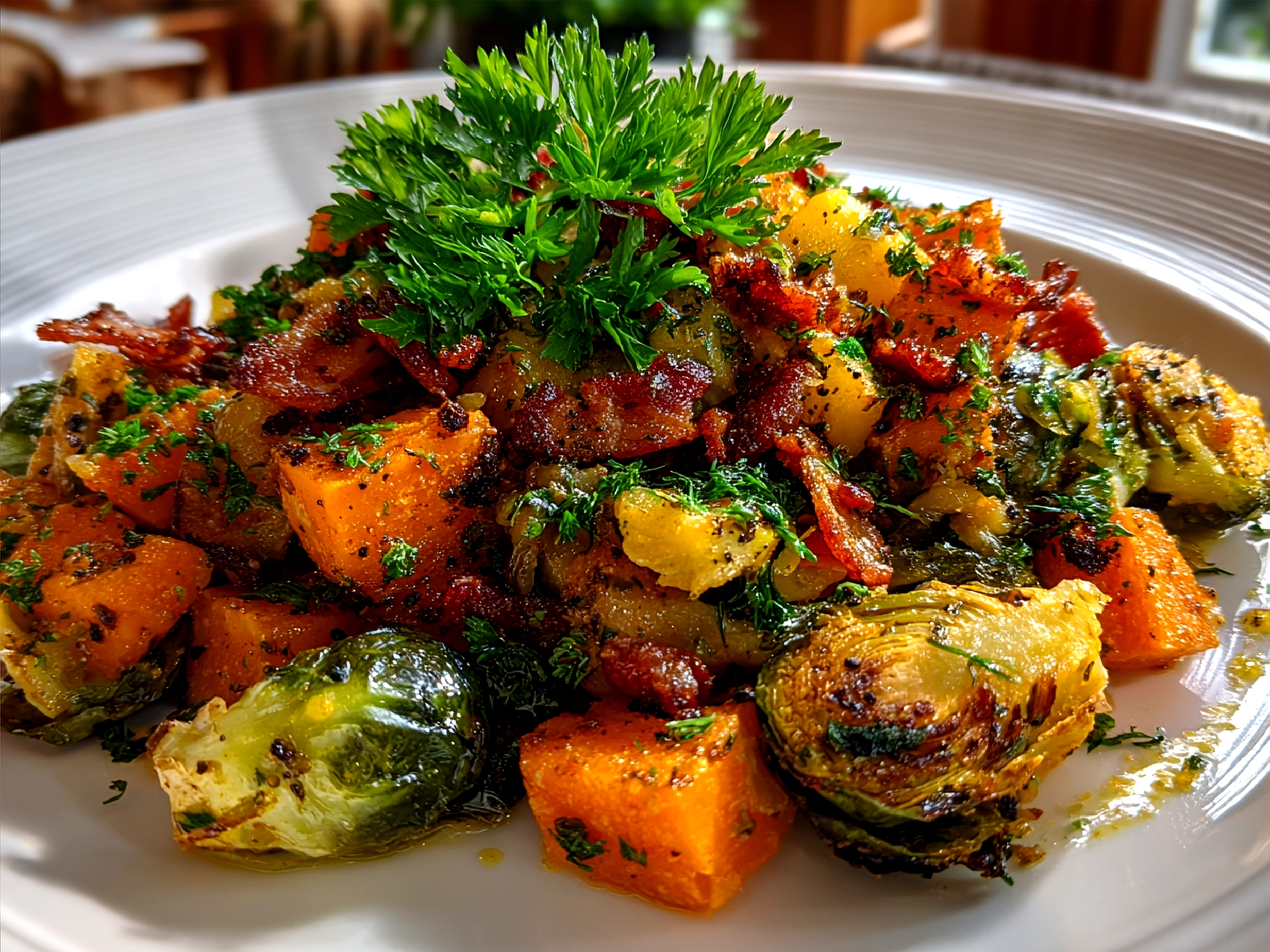 A hearty and flavorful Sweet Potato Brussel Hash combining tender sweet potatoes and crispy Brussels sprouts for a wholesome breakfast or side dish.